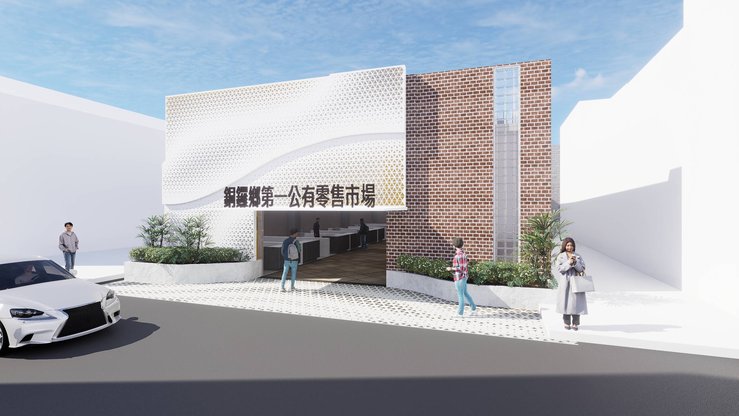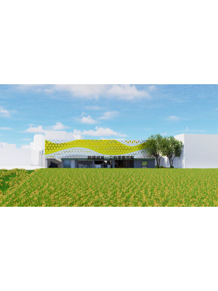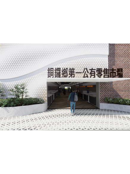 設計主題取自苗栗代表性的杭菊,象徵地方產業與人文底蘊。建築外觀轉化杭菊盛開、綻放與重複韻律,融入金屬沖孔板、創造韻律感與花叢的意象設計,呈現自然生長與節奏秩序的平衡。整體市場空間在功能更新之外,也藉由意象再現與環境整合,展現銅鑼在地風土與生活文化的延續與再生。